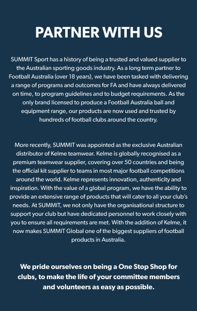 SUMMIT Sport has a history of being a trusted and valued supplier to the Australian sporting goods industry. As a long term partner to Football Australia (over 18 years), we have been tasked with delivering a range of programs and outcomes for FA and have always delivered on time, to program guidelines and to budget requirements. As the only brand licensed to produce a Football Australia ball and equipment range, our products are now used and trusted by hundreds of football clubs around the country.