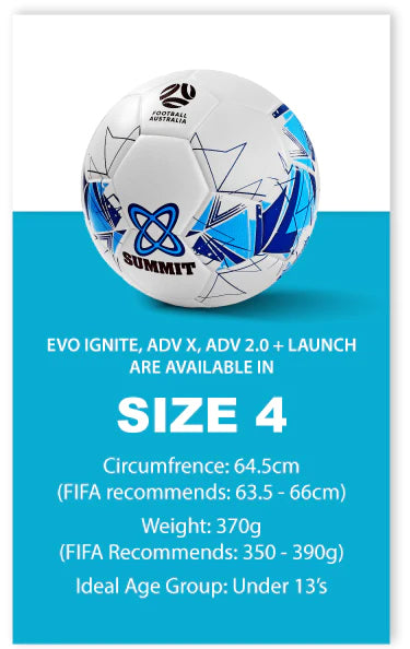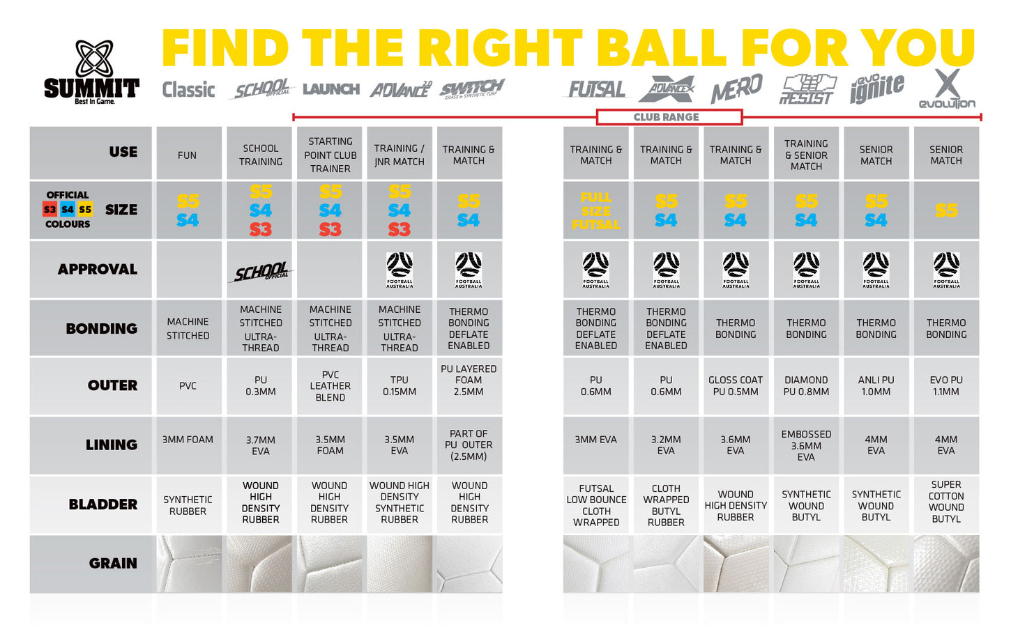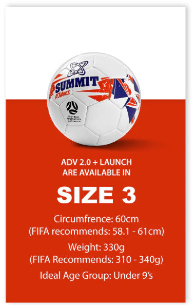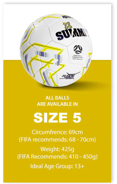 Every SUMMIT football comes with a Football Australia stamp to signify its size. These colour grades make it easy to match size and needs quickly and effectively. Not only this, but the designs also reflect the colours of the sizes, again, helping you find the right size ball in the storage shed quickly before training.