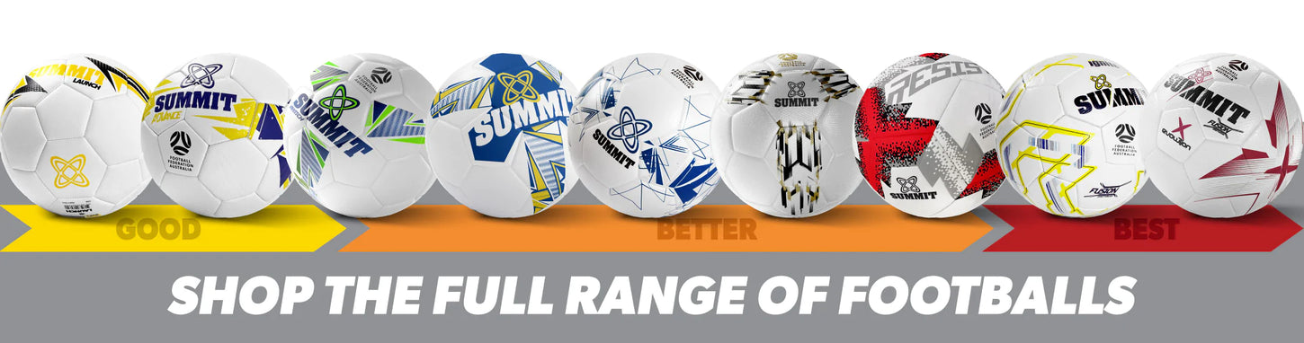 From inside out, SUMMIT pushes to be the best. Used by clubs around the world out latest range of footballs are pushing the limits of endurance and quality. Endorsed by Football Australia, our range is used by all levels of soccer players. Designed to deliver the best quality at all levels, there is a ball for every use. We believe our balls are so good they are guaranteed to 12 - 24 months, making them some of the longest guarantees within the industry.